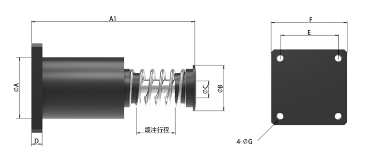 安裝要求:緩沖行程在300mm以?xún)?nèi),較大允許側(cè)負(fù)荷角度為2.5°;緩沖行程為300mm以上,較大允許側(cè)負(fù)荷角度為1°;確保螺栓螺母鎖緊牢固,建議使用螺紋膠。